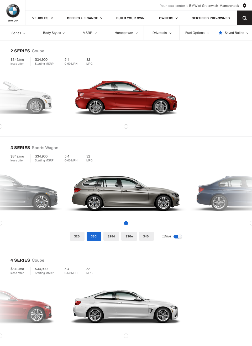 This iteration allows users toggle xDrive on and off in their selection as opposed to listing out BMW 330i and BMW 330i xDrive separately. This toggle reduces the number of models shown by half.
